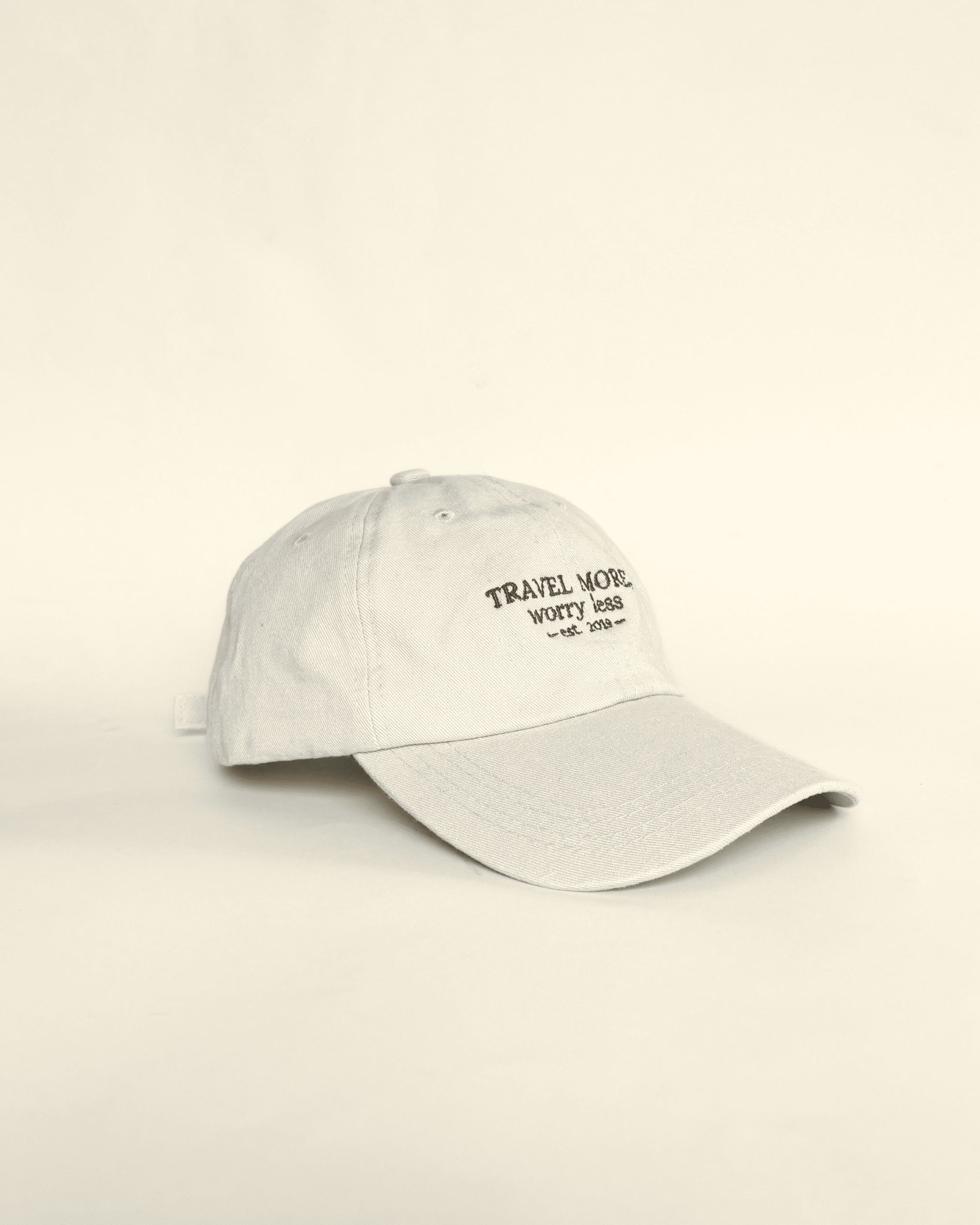 Gorra de gabardina color crema con diseño de frase «Travel more, worry less» en bordado colo azul marino.